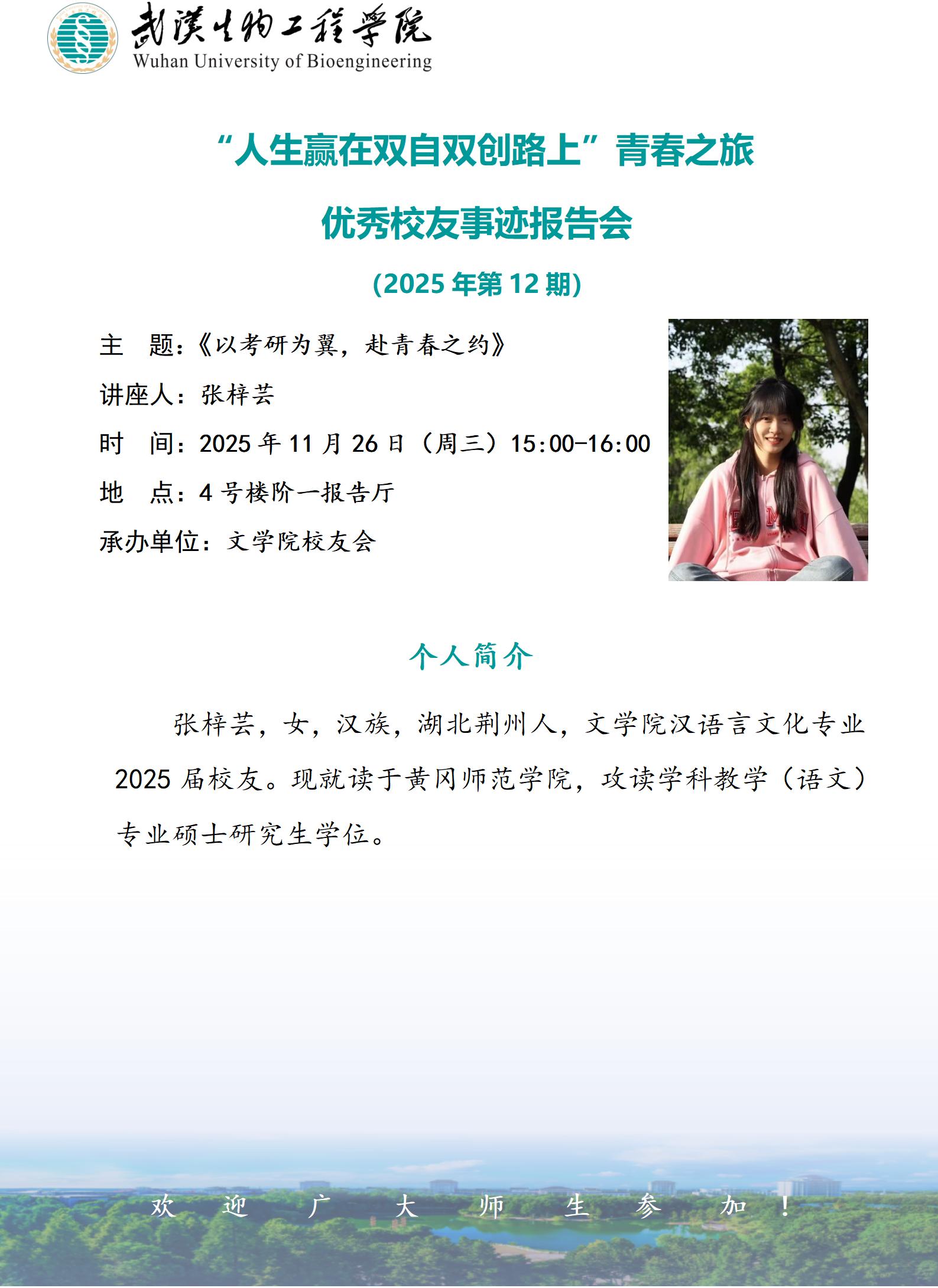 【双自双创】张梓芸作题为“以考研为翼,赴青春之约”优秀校友事迹报告会预告