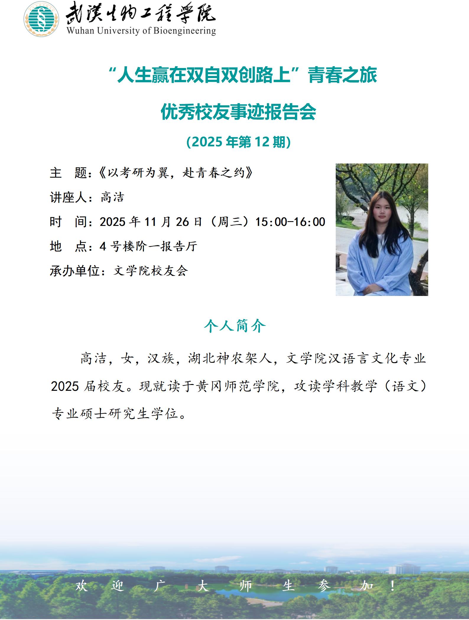【双自双创】高洁作题为“以考研为翼,赴青春之约”优秀校友事迹报告会预告