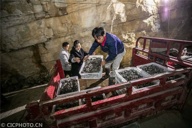 2020年11月3日,村民在贵州省毕节市大方县鼎新乡长丰村的溶洞里将采收的食用菌装车。CICPHOTO/罗大富 摄