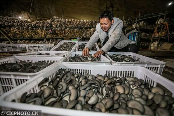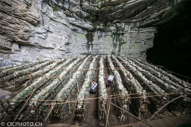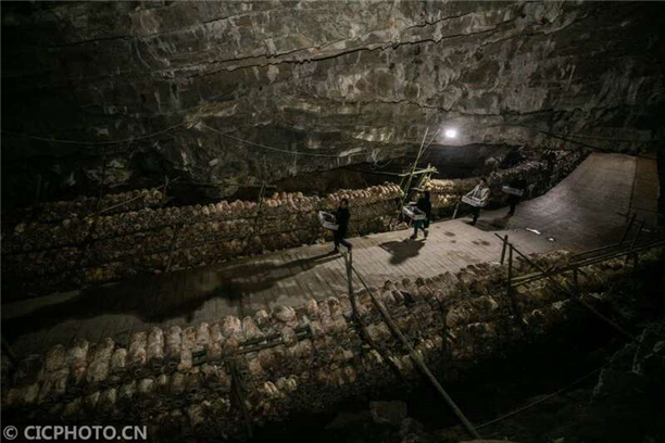 2020年11月3日,村民在贵州省毕节市大方县鼎新乡长丰村的溶洞里采收食用菌。CICPHOTO/罗大富 摄