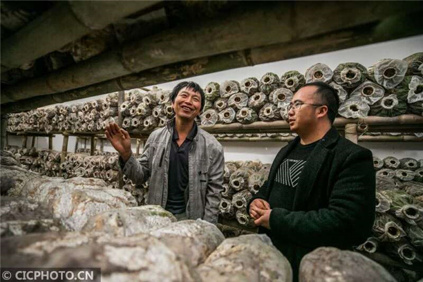 2020年11月3日,杨臣(右)在贵州省毕节市大方县鼎新乡长丰村村民的家中现场教授食用菌室内培植技术。CICPHOTO/罗大富 摄