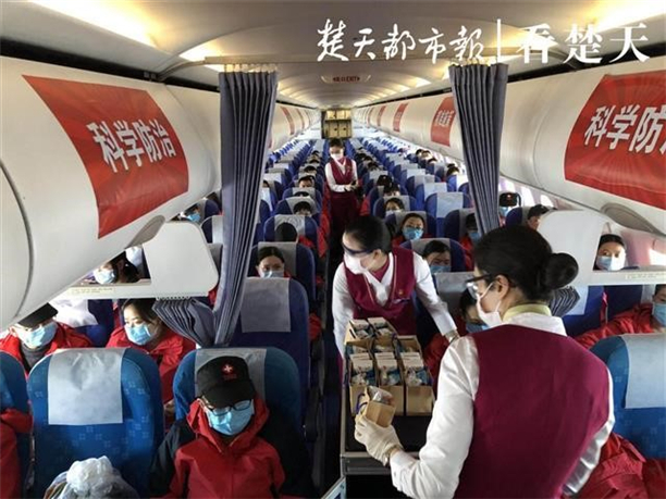 图为空乘人员为驰援武汉的医护人员发放食品