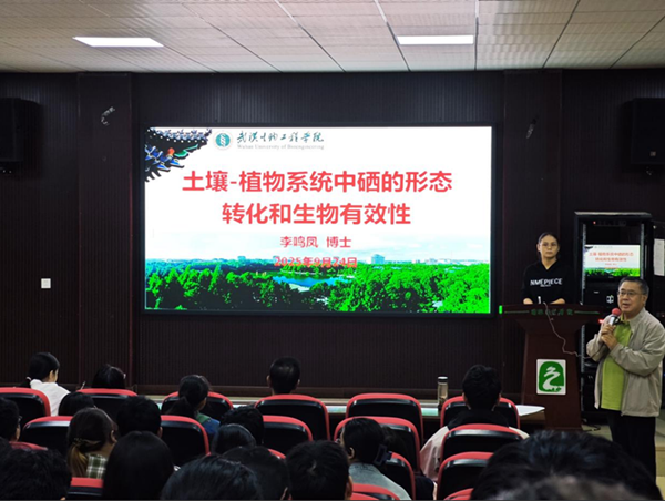 讲座伊始,陈中义院长对李鸣凤博士的教学与科研背景作了简要介绍。随后,李鸣凤博士从硒与人体健康的关系切入,系统阐述了硒在土壤-植物系统中的形态转化过程及其生物有效性。她重点讲解了硒含量对作物生长、品质及土壤环境的调控机制,指出硒在不同含量水平下对植物和人体健康均具有不可忽视的影响。