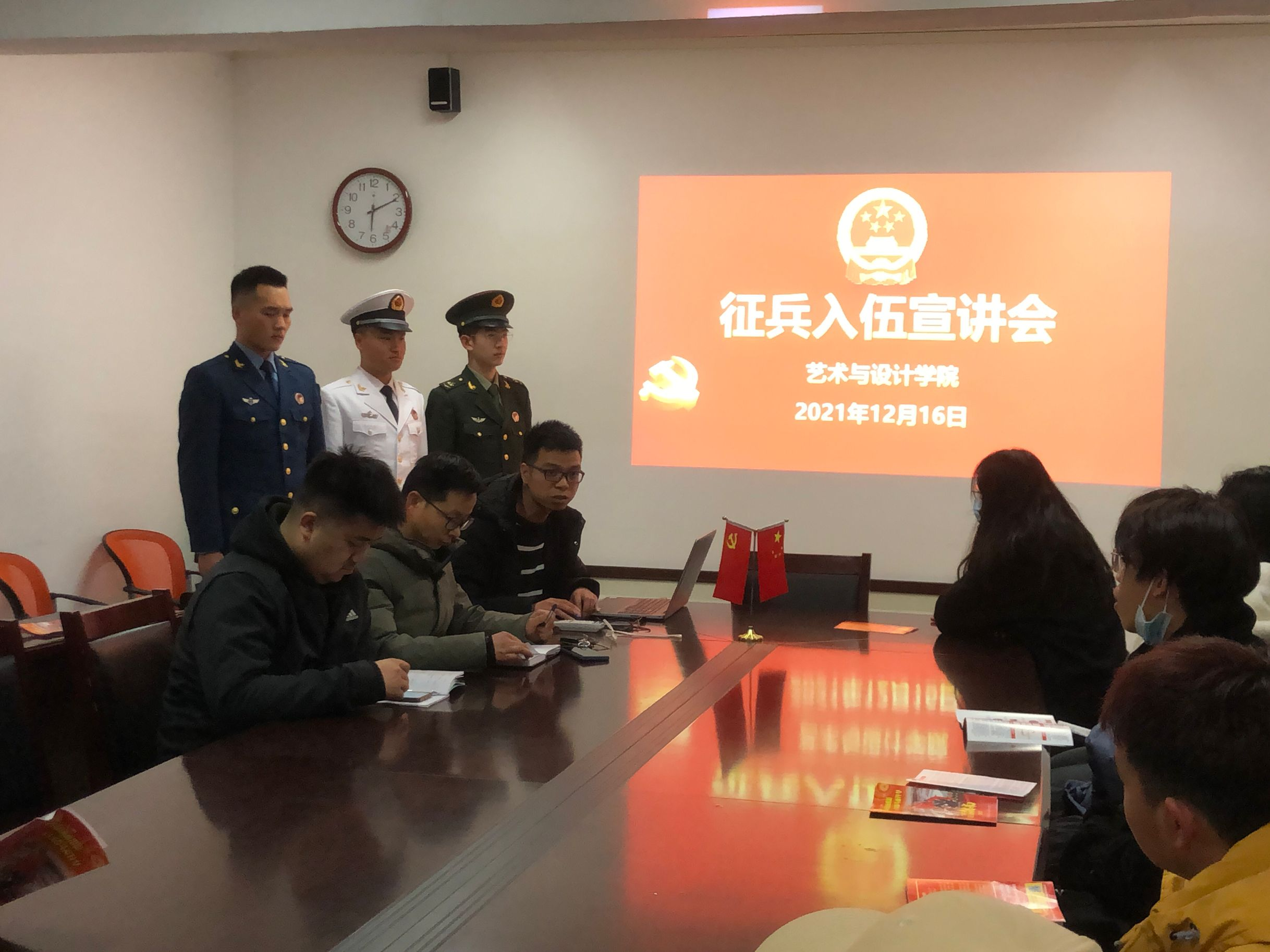 本网讯(通讯员:汪涛记者:李梦蝶)为积极响应国家和学校的号召,全面做好2022年大学生征兵宣传动员工作,2021年12月16日18:00,艺术与设计学院在西裙楼312会议室召开大学生征兵入伍宣讲会。艺术与设计学院党总支副书记陈海浪、毕业班辅导员汪涛、李源以及全体意向入伍学生参会。会议邀请武生院征兵入伍宣讲团成员陈泳钢、邱浩楠、王艺桦主讲。