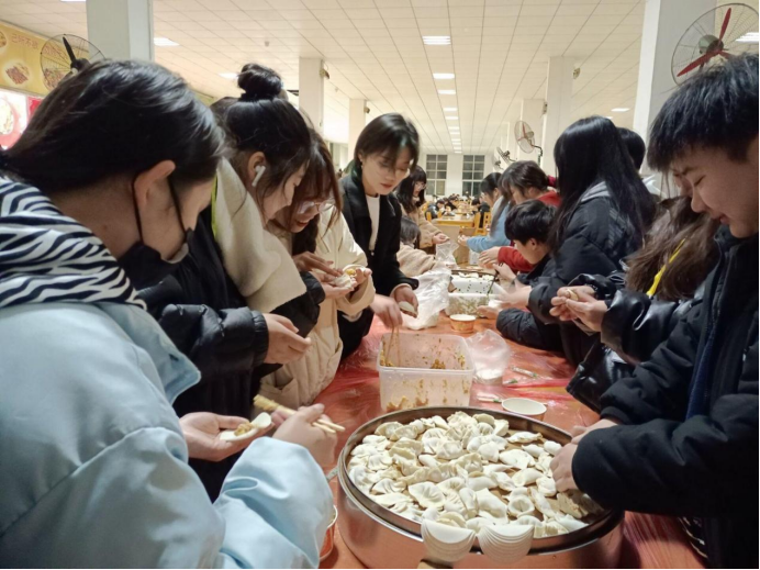 晚上六点半活动准时开始,很多同学早早就已经来到现场。食堂管理者拿出事先准备好的饺子皮和饺子馅放在大桌上,两个学院的同学们便围站在一起包饺子,大家都摩拳擦掌,跃跃欲试,有的同学动作娴熟,有的同学也正有模有样地学做起来,大家包出来的饺子也是各式各样,别致精巧。每一颗可爱的饺子都蕴含着每一位同学的暖暖心意。