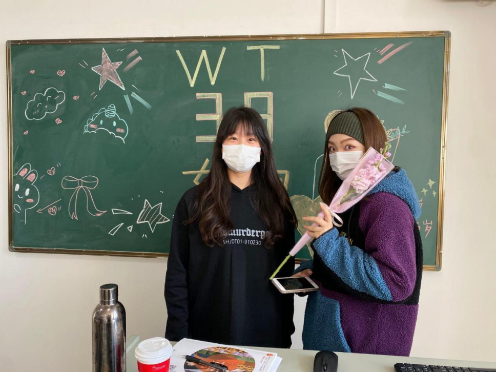 在“女神节”到来的前一天晚上,志愿者们来到钱学森大楼,在教室携手绘制以“3.8女神节”为主题的黑板报。每位志愿者结合主题,认真设计,将鲜花、蝴蝶结等元素融入设计之中,让黑板报上洋溢了浓浓的“女神气息”。3月8日女神节到来之际,我们的志愿者为女老师们献上了鲜花,感谢了老师有史以来为学生以及教育事业的辛勤付出,每朵花都包含着学生们的感恩之情。老师们看到我们精心绘制的黑板报时,纷纷都解颜而笑。为定格这美好的时刻,志愿者与女老师们合影纪念。
