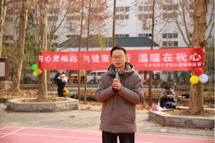 活动伊始,由艺术与设计学院党总支副书记陈海浪老师做本次活动的致词,他表示,此次温暖伴我行活动的展开,旨在丰富同学们的趣味生活,帮助同学们缓解压力,从而树立健康乐观的心态,积极投入于学习与生活中去。