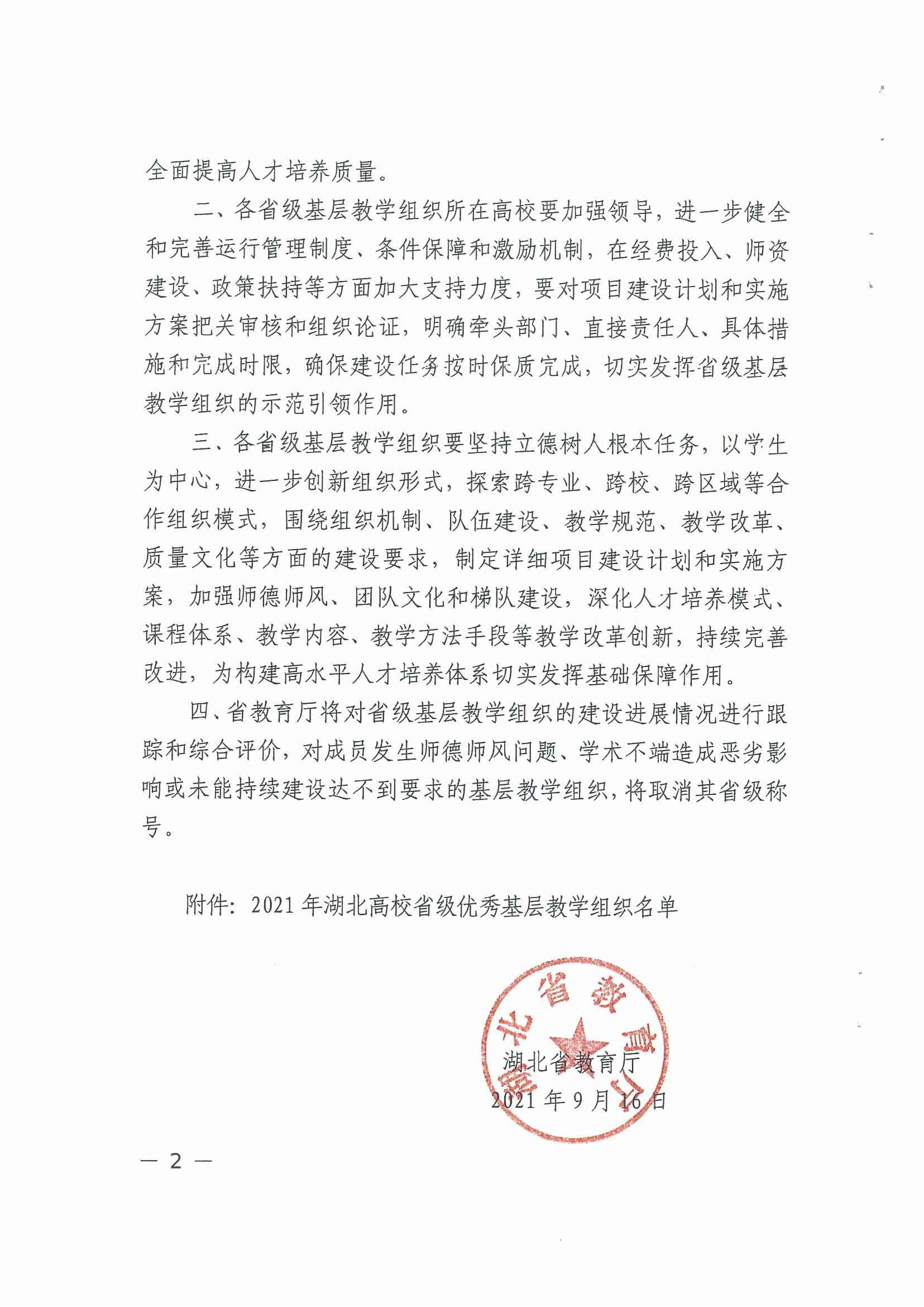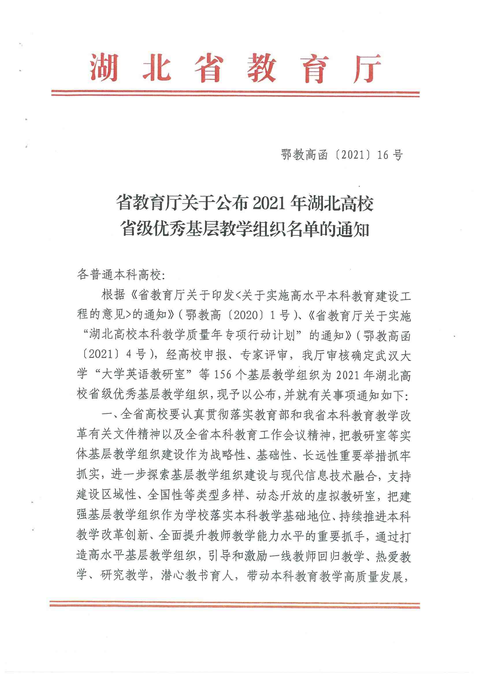 基层教学组织是高等学校立德树人、落实教学任务、促进教师教学发展、开展教研活动、推进教学改革的基本教学单位,是联系教师与学生、落实教学工作的“最后一公里”,其承上启下的位置和作用十分重要,直接关系到学校的教学水平和人才培养质量。2021年度,共有156个基层教学组织获批湖北高校省级优秀基层教学组织。