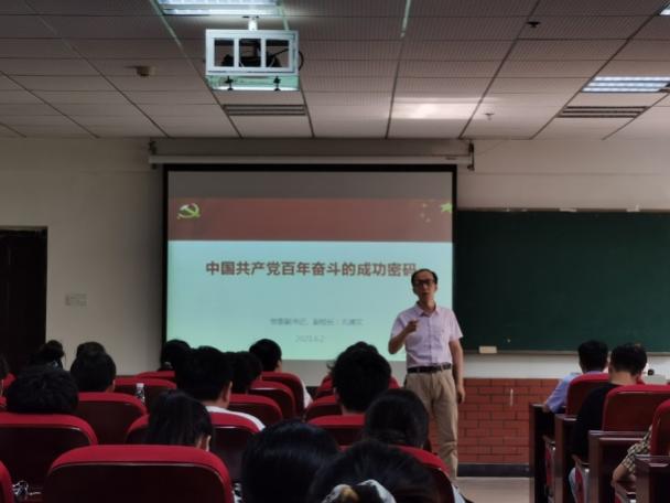 孔书记以“我们为什么要学习党史?中国共产党伟大在哪里?成功密码是什么?”等问题开篇进行宣讲,围绕国家新颁布的政策、中国共产党产生前的国内外背景、在近现代四个阶段中国共产党如何带领全国人民英勇奋斗从而走向光明前景等,深刻阐述了对中国共产党的理解,引发了同学们的深入思考。重点分享了中国共产党百年奋斗史丰功伟绩,分析中国共产党百年奋斗的成功密码就是中国共产党人的初心和使命,就是为中国人民谋幸福,为中华民族谋复兴。讲座中他用一个个鲜活生动的历史故事,使中国共产党的伟大形象深深的印在了师生脑海中。