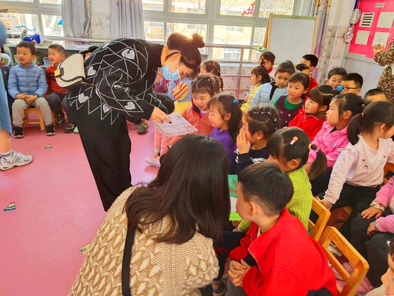 志愿者们向小朋友们展示自己所绘制大自然的手抄报,为小朋友们讲述画面所绘制的内容,并详细解释了手抄报上标语的含义,引导小朋友们热爱绿色、保护自然。