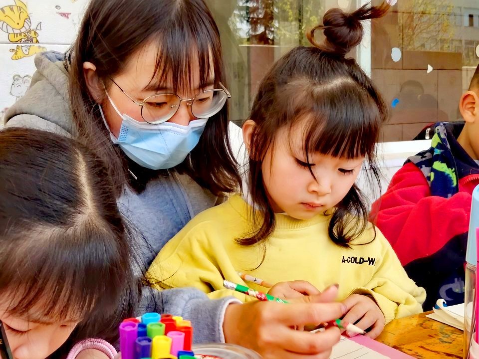(图为志愿者一对一指导小朋友)