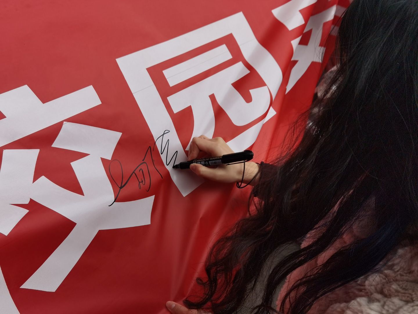 (图为参与演习人员在横幅上签字)