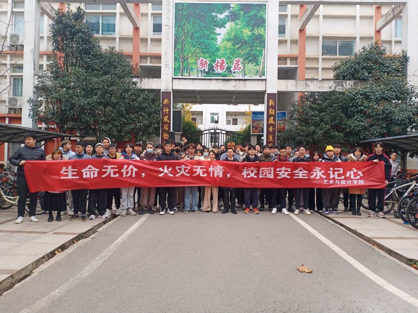 最后在同学们成功的将大火扑灭后,调度人员组织所有参与演习人员在横幅上签字示警。