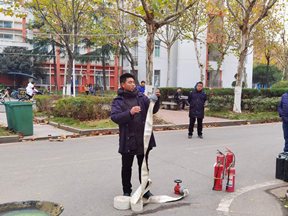 辅导员曹老师向同学们介绍了容易引发火灾的使用违规电器的行为以及室内吸烟的行为,希望同学们遵守校纪校规,以避免不必要的安全隐患。学校保卫人员在北二公寓前的空地向同学们演示了灭火器和水泵的使用方法,并讲解相关知识,很多同学也体验了用正确的方法使用消防栓灭火。