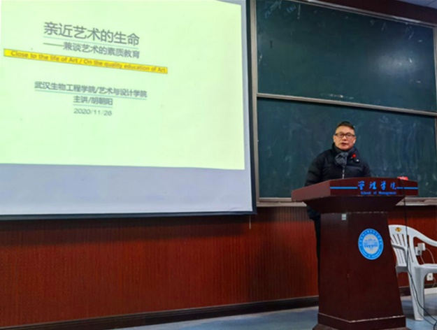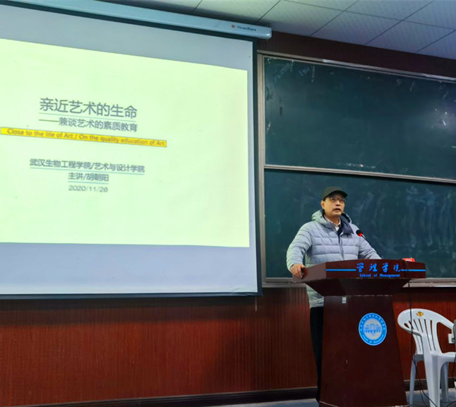 首先胡朝阳教授向组织,筹备此次讲座的工作人员致谢,向前来参与讲座的老师,学生表达了问候。胡朝阳教授以“欣赏艺术是思想的渊源”为主题向到场的听众阐述了艺术对人以及人生的影响。
