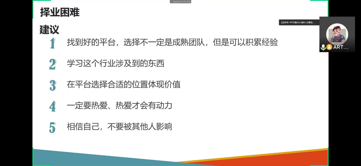 本次“线上创业和择业沙龙”由武生院创业之家,长河筑梦众创空间,艺术与设计学院,武汉辛逸创业文化发展有限公司联合举办,为学生们提供了就业择业的选择方向,思路和技巧。通过对疫情期间择业、创业的相关问题进行剖析和引导,为广大毕业生和创业学生传授了方法,指明了方向,增加了信心。