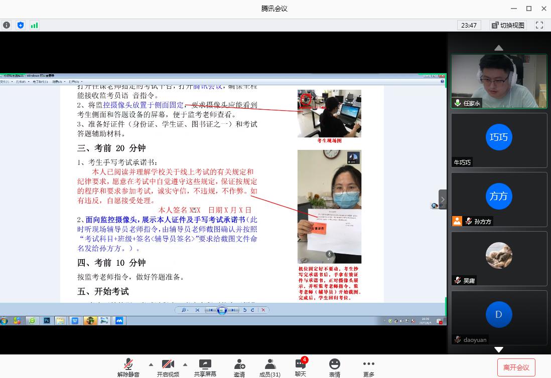 最后,任家永再次强调,每位老师要履职尽责,按照考试流程和具体要求,严格监考,杜绝违纪、作弊现象的发生,以高标准完成线上监考工作。