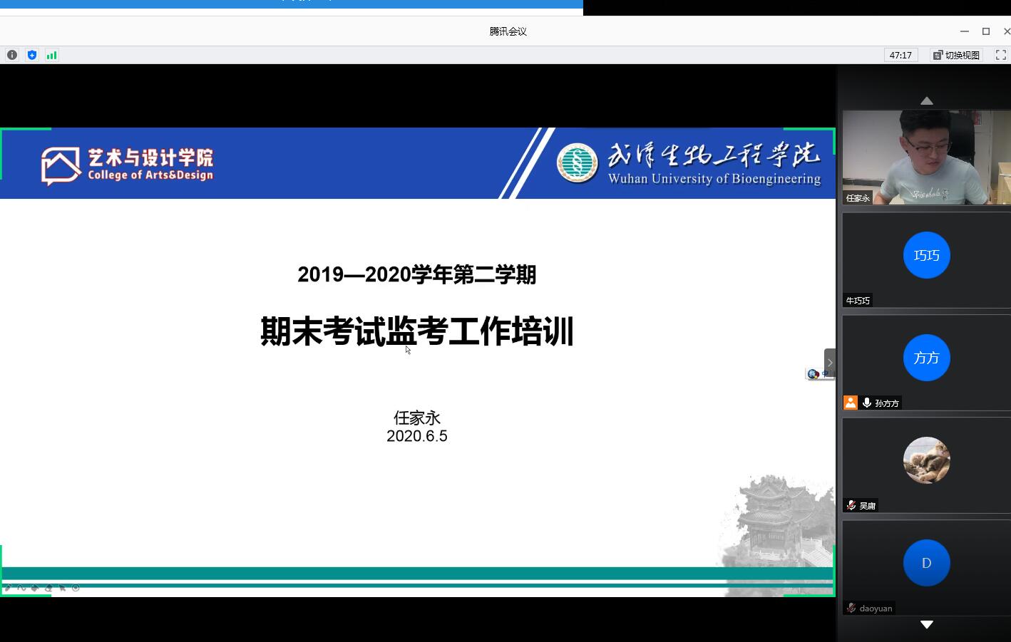 本网讯(通讯员 夏镇杰孙方方)为做好本学期在线期末考试监考工作,完善线上监考工作机制,明确线上监考的要求、方法,提高学院在线考试整体质量,我院于6月5日下午通过腾讯会议平台,开展了本学期期末考试监考工作培训会,由艺术与设计学院常务副院长任家永主讲,全体无课专兼职教师参加。