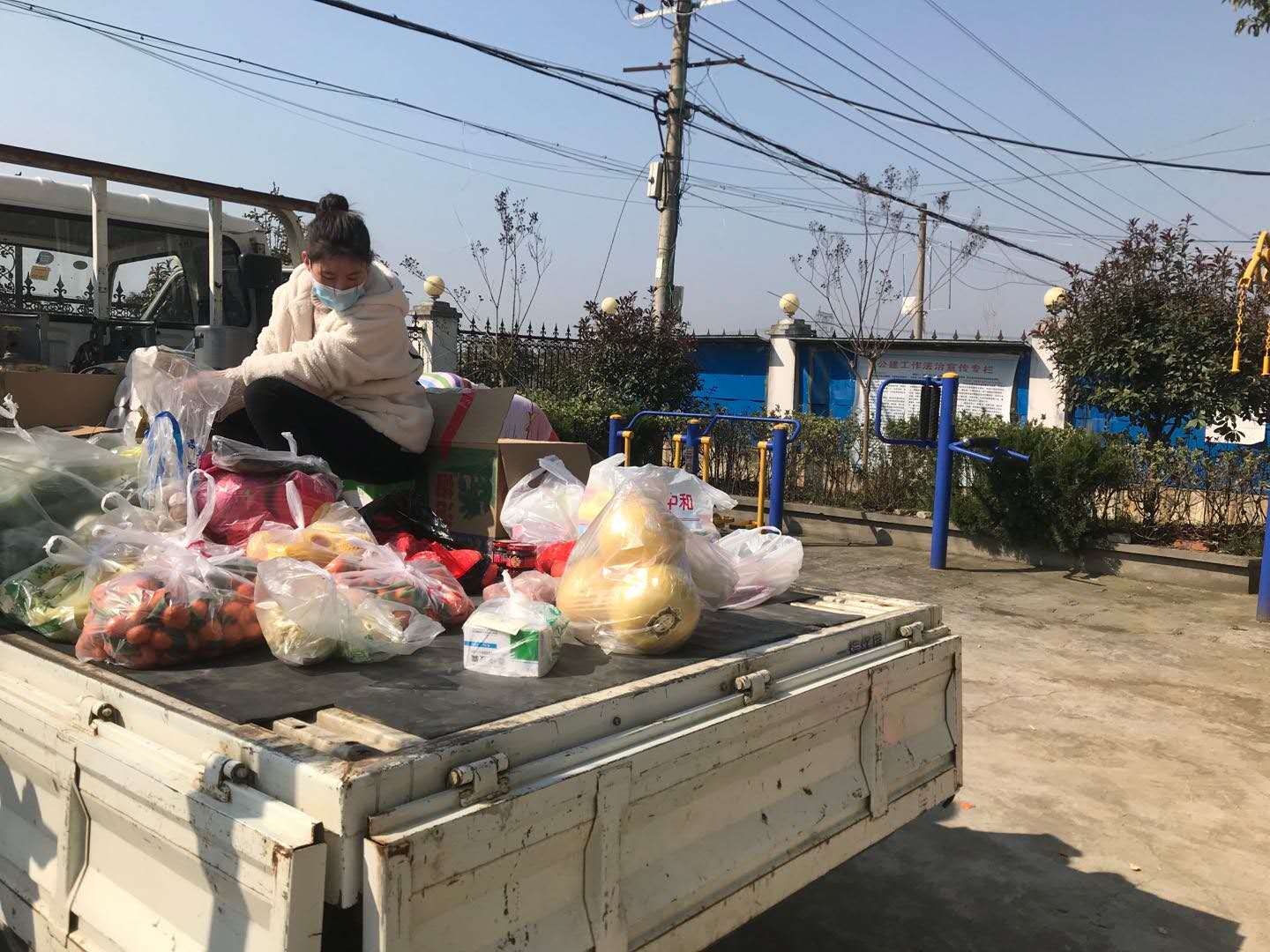 图为章雅思同学为居民采购和分发生活用品