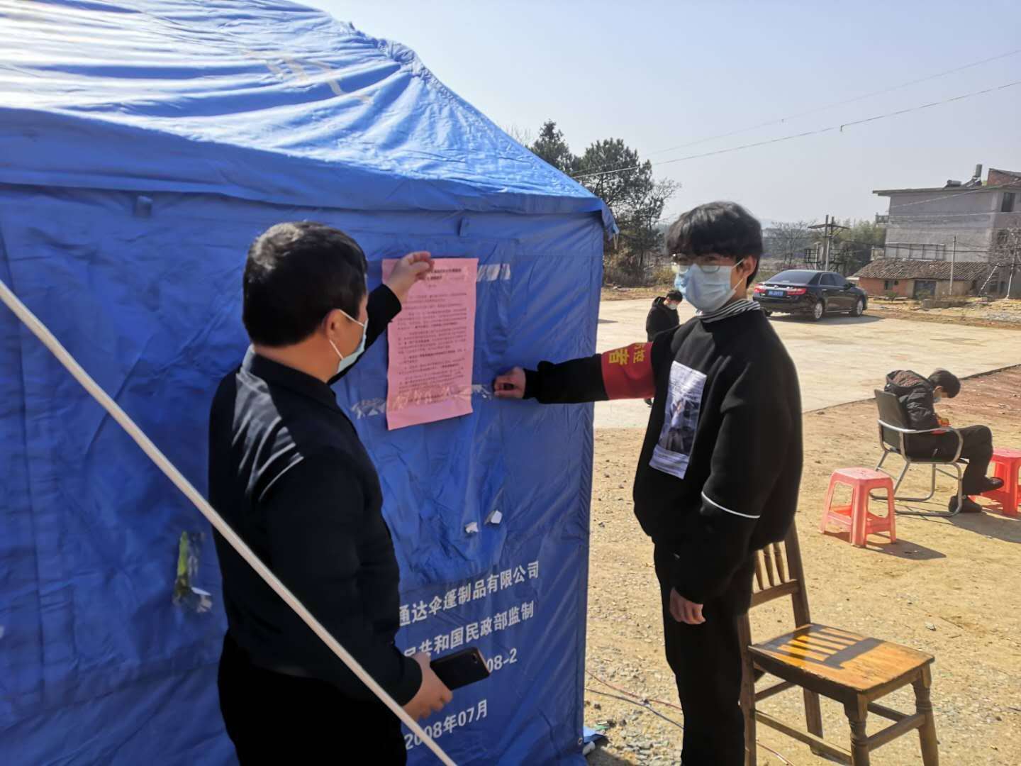 图为黄文康同学(右)向村民宣讲抗“疫”政策和防疫知识