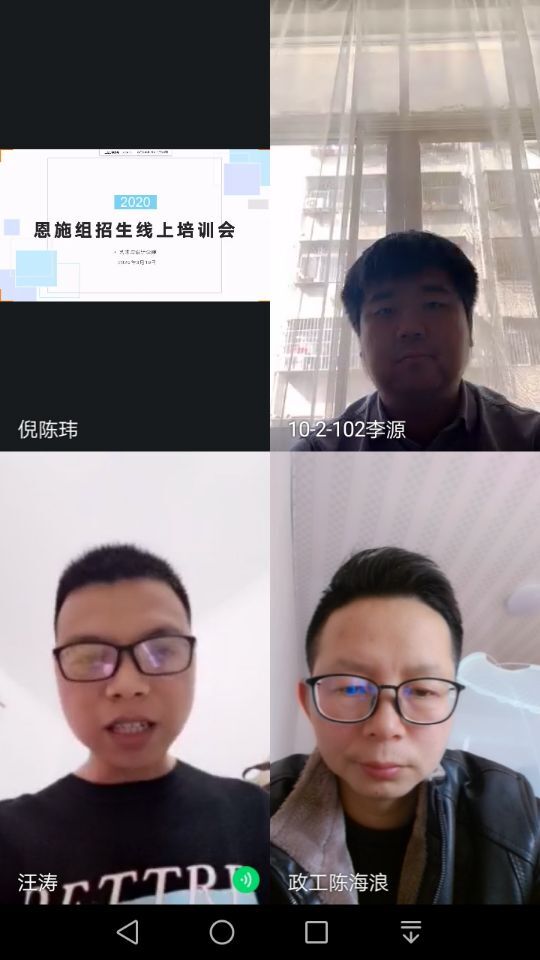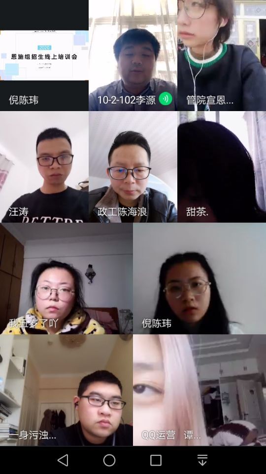 会议由李源老师主持,陈海浪副书记,汪涛老师做了培训,李源老师向宣传小组介绍了招生宣传的主要形式,恩施地区实地招生及咨询群宣传等工作,鼓励学生活跃思维,积极探索创新宣传方式。陈海浪副书记从招生意义、队伍组建、招生培训与技巧、如何搞好招生工作等四个方面进行了培训,动员学生们主动学习我校的招生宣传政策和校情校史,扩大我校招生宣传影响力,积极拓展宣传渠道、平台。他说,在这个特殊的情况下的特殊培训会,我们更要努力开展工作,壮大队伍,用自学和培训相结合的方式提升我们的招生宣传能力。汪涛老师勉励19级的学生积极参与到招生宣传的行动中来,动员更多的同学为招生传宣工作做出贡献。与会同学认真记录培训内容,表示会积极学习政策和技巧,努力为学校招生工作贡献力量。