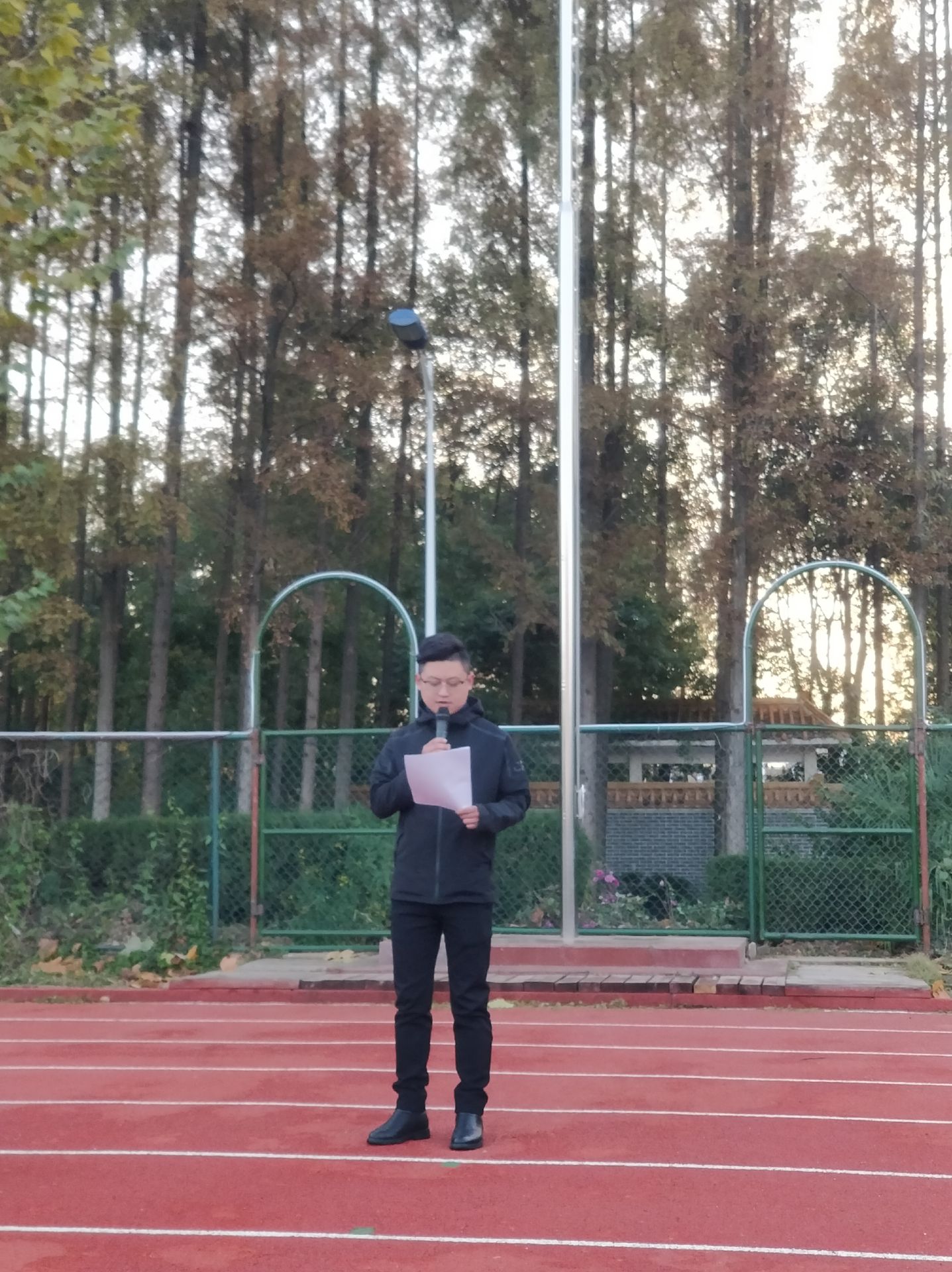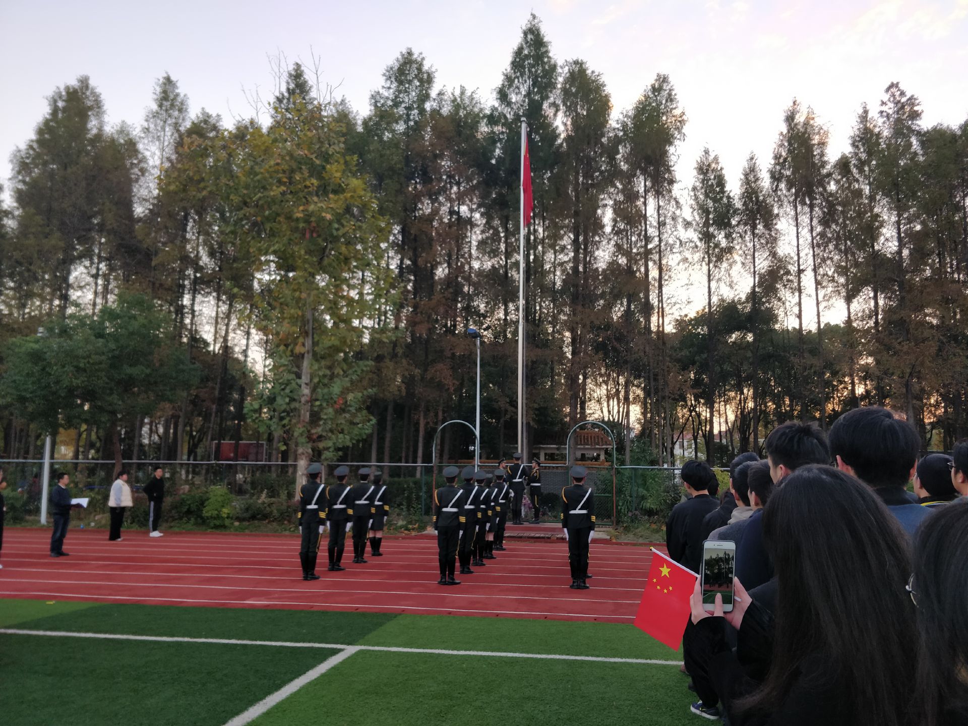 早上六点四十分全院师生列队集合完毕,迎着清晨的阵阵微风在国旗台前等候。六点五十,我院党总支副书记陈海浪宣布升旗仪式正式开始,国旗护卫队的同学们昂首挺胸,迈着庄严而整齐的步伐向国旗台走去。“升国旗,奏国歌,全体成员行注目礼”伴着庄严嘹亮的国歌,五星红旗冉冉升起。全体师生庄严肃立,目光聚集在迎风飘扬的五星红旗上。尽管早上气温只有一到两度,但依然可以从师生们的眼中看到那份爱国的炽热。