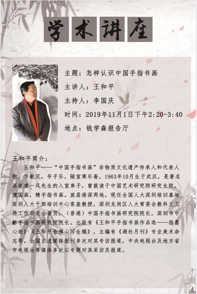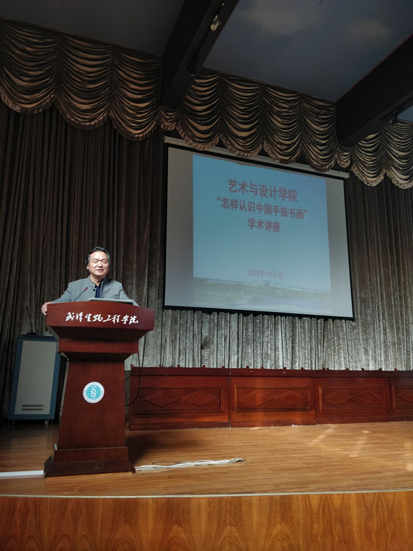本网讯(通讯员 夏镇杰)古墨轻磨满几香,砚池新浴灿生光。11月1日下午,艺术与设计学院于我校钱学森报告厅举办《怎样认识中国手指书画》学术讲座,邀请“中国手指书画”非物质文化遗产传承人和代表人物、(香港)中国手指书画研究院院长王和平老师作为主讲人,我院无课教师和书画爱好学生应邀共赴笔墨盛宴。