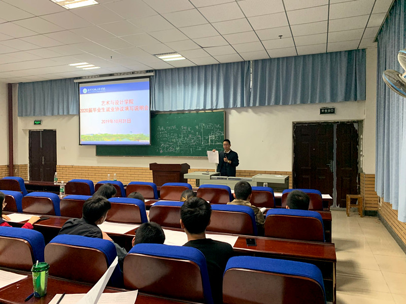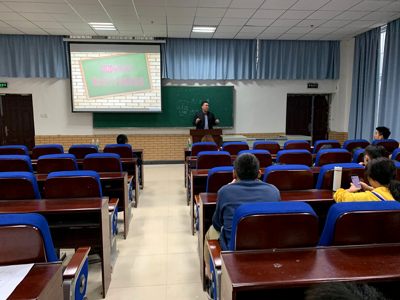 本网讯(通讯员 夏镇杰)为了引导2020届毕业生更快更好地就业,10月31日下午,艺术与设计学院在钱学森大楼109教室召开了2020届毕业生就业及行业现状培训会。培训会邀请武汉天海饰家装饰有限公司总经理李鹏鹏为2020届毕业生作报告,我院党总支副书记陈海浪、毕业班辅导员和全体2020届毕业生参与。