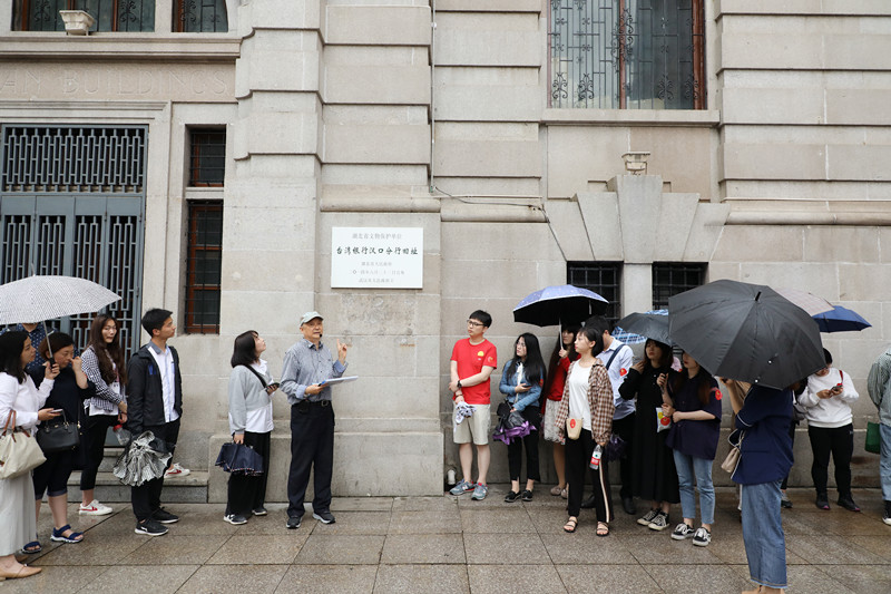 图为王汗吾老师介绍台湾银行汉口分行旧址
