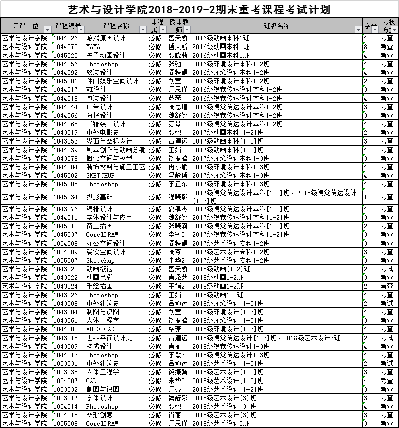 艺术与设计学院2018-2019-2期末重考课程考试计划