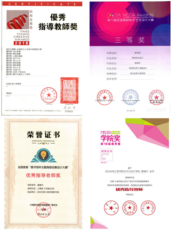 艺术与设计学院2018年国家级、省级专业竞赛教师获奖15项,其中第七届全国海洋文化创意设计大赛获奖1项,第二十七届时报金犊奖获奖1项,“宣传国家资助政策 感恩资助助力成长”主题宣传画设计竞赛获奖2项,第六届全国高校数字艺术大赛获奖2项,第十六届中国大学生广告艺术节学院奖春季赛获奖1项,第二届“国青杯”全国高校艺术与设计作品展评获奖4项,全国首届图书馆杯主题海报创意设计大赛获奖1项,湖北省首届“图书馆杯”主题海报创意设计大赛获奖2项,第十六届中国大学生广告艺术节学院奖秋季赛获奖1项。