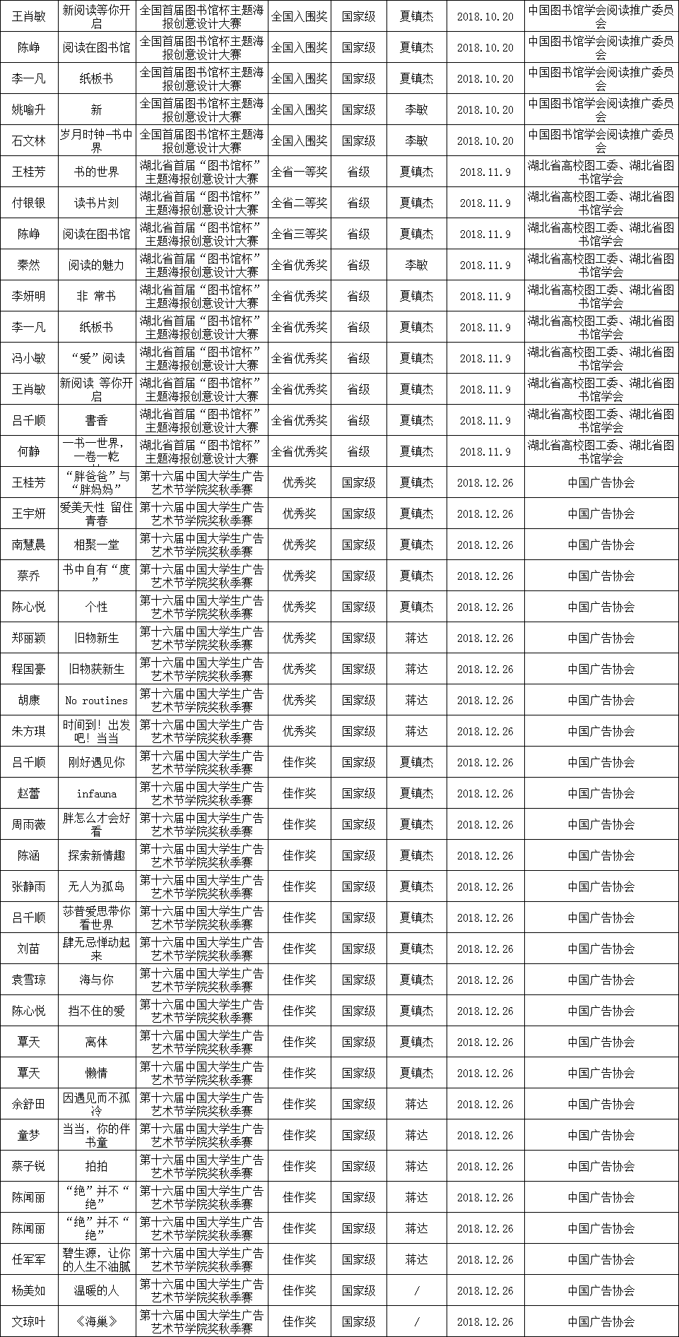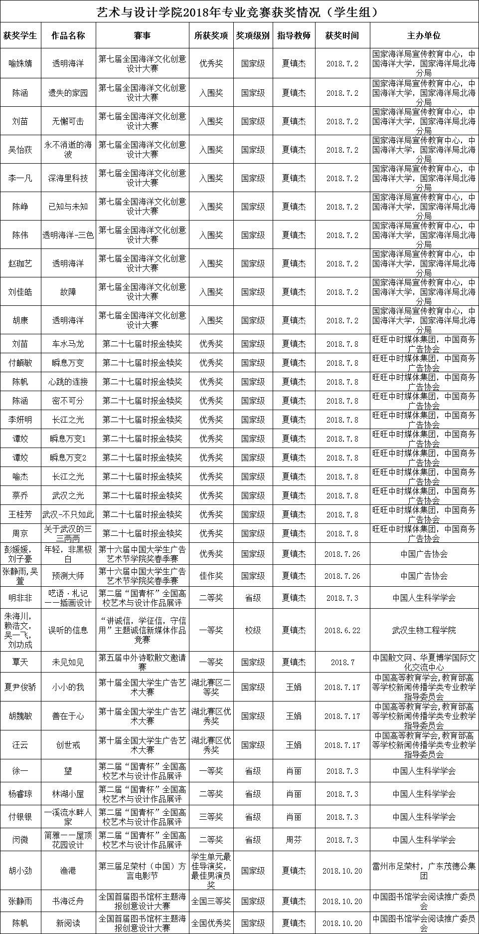 图为艺术与设计学院2018年学生专业竞赛获奖情况(部分)
