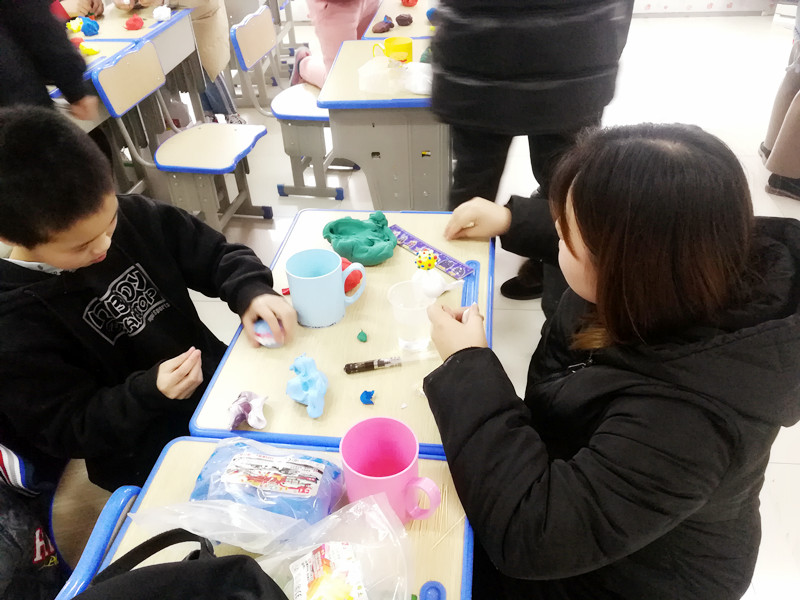 图为艺术学院青协志愿者们教孩子们制作黏土玩偶