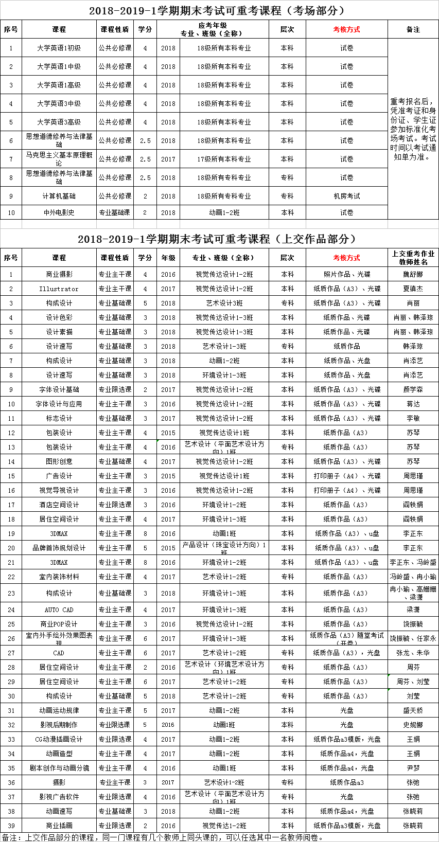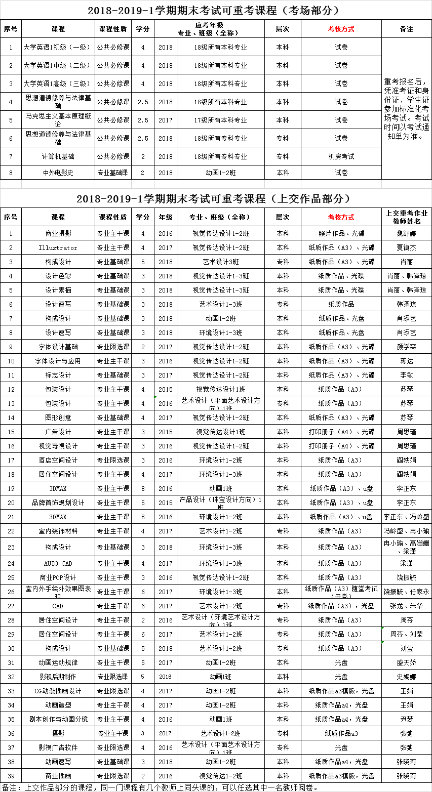 艺术与设计学院2018-2019-1学期期末重考考试课程参考(专业必修+公共必修课)
