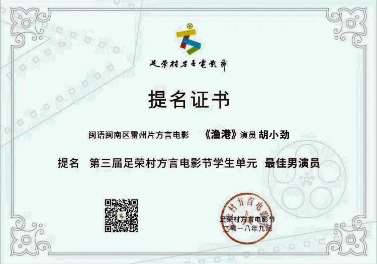 本网讯(通讯员:夏镇杰)10月20日晚,第三届足荣村(中国)方言电影节在广州茂德公草堂举行颁奖典礼,众多嘉宾共同见证了17项大奖的诞生。新华社、人民日报、国际商报社、中国经营报、北京日报、南方日报、广东广播电视台、湛江市广播电视台、网易直播等30多家媒体记者齐聚现场。我院15级艺术设计(平面艺术设计方向)胡小劲同学闽南语方言微电影《渔港》从全国965部方言电影中脱颖而出,获得学生单元最佳导演和最佳男演员奖。