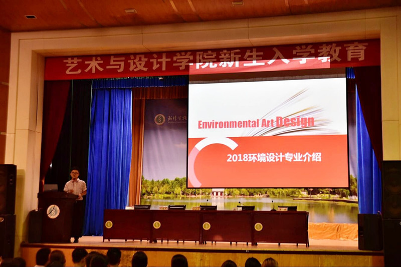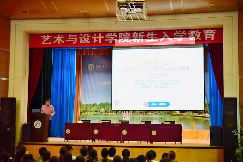 陈书记作为主持人拉开了专业介绍的序幕,他首先欢迎了各位新生的到来,并介绍了到场的教师代表。紧接着,由动画教研室主任王娟老师为同学们带来了动画的专业介绍,王娟老师结合市场需求,指出我院动画专业分游戏和影视两个方向,她通过丰富的动画视频案例和学生动画作品,帮助同学们了解了动画专业涉及到的内容和就业方向;随后,平面艺术设计教研室夏镇杰老师针对视觉传达设计和艺术设计(平面艺术设计方向)两个专业,进行了专业介绍,他结合学生商业孵化项目和赛事获奖对专业进行了细致的讲述,他同时指出,虽然本专科学年不一致,但是我们的本专科会做到师资共享、资源共享、成果共享,不落掉每一位学生;最后,环境艺术设计教研室任家永老师对环境设计和艺术设计(环境艺术设计方向)进行了专业介绍,他首先通过生动有趣的案例强调了学习本专业必须做出吃苦的准备,并展示了师生们设计的校园室内和景观作品,指出了本专业的实用性和与其他专业的交融性,希望同学们能够在大学三年或四年中学好专业,打好基础,踏踏实实做出一番成绩。