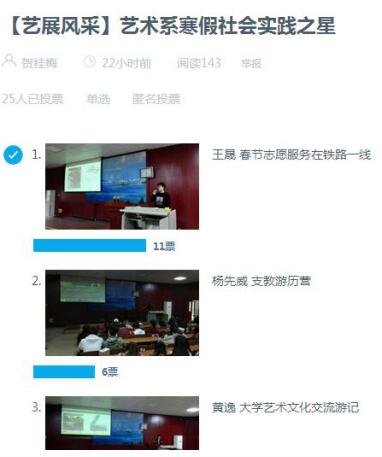 据了解,艺术系寒假社会实践的成果还通过易班平台进行投票,评选出艺术系“寒假社会实践之星”,目前投票正在进行中。