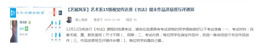 本网讯(通讯员宋颖颖 张蕾)12月12日下午,艺术系贺桂梅老师在钱学森大楼101教室开展了15级视觉传达班《书法》课期末作品互评进易班的活动,将自己的《书法》课与易班平台相结合。