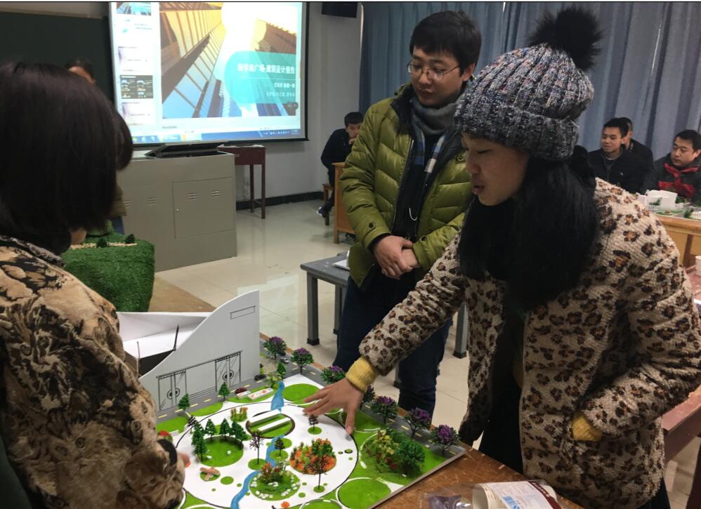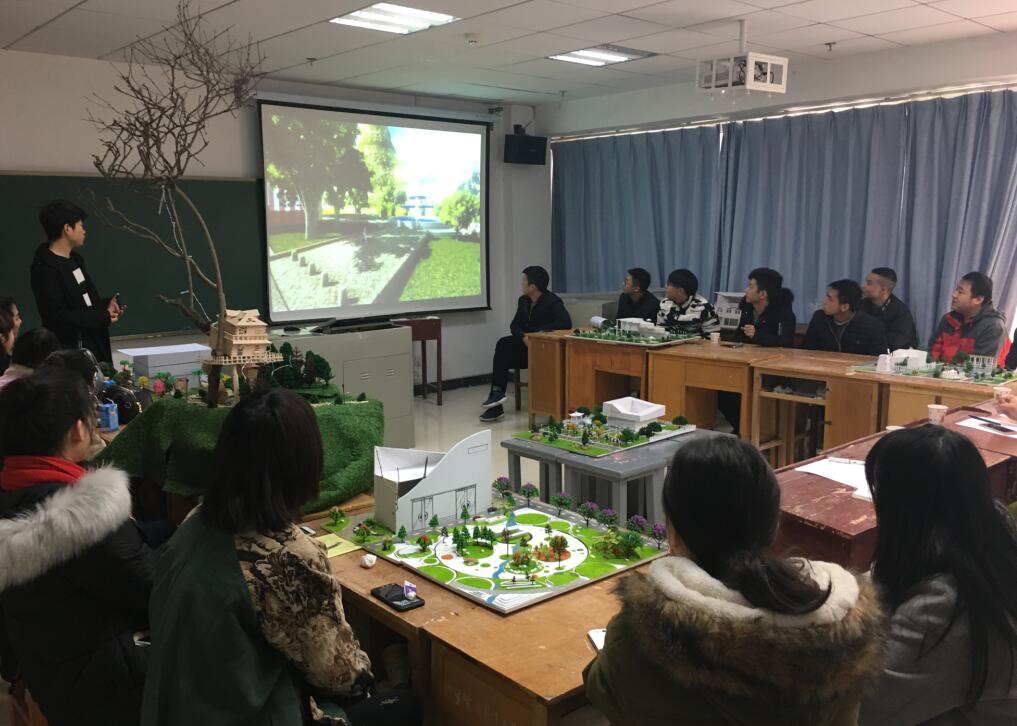 王洋邀请了我校园林系的段然老师、建筑工程学院的胡长威老师、赵雄辉老师等专业教师跟他本人一起,对学生的期末作业进行评估。先由每个小组的发言人对小组合作完成的模型进行介绍和设计说明,再播放学生自己亲自制作的视频来加深对模型的立体效果图展现。然后,邀请的专业教师和王洋一起,对学生的作品进行点评。