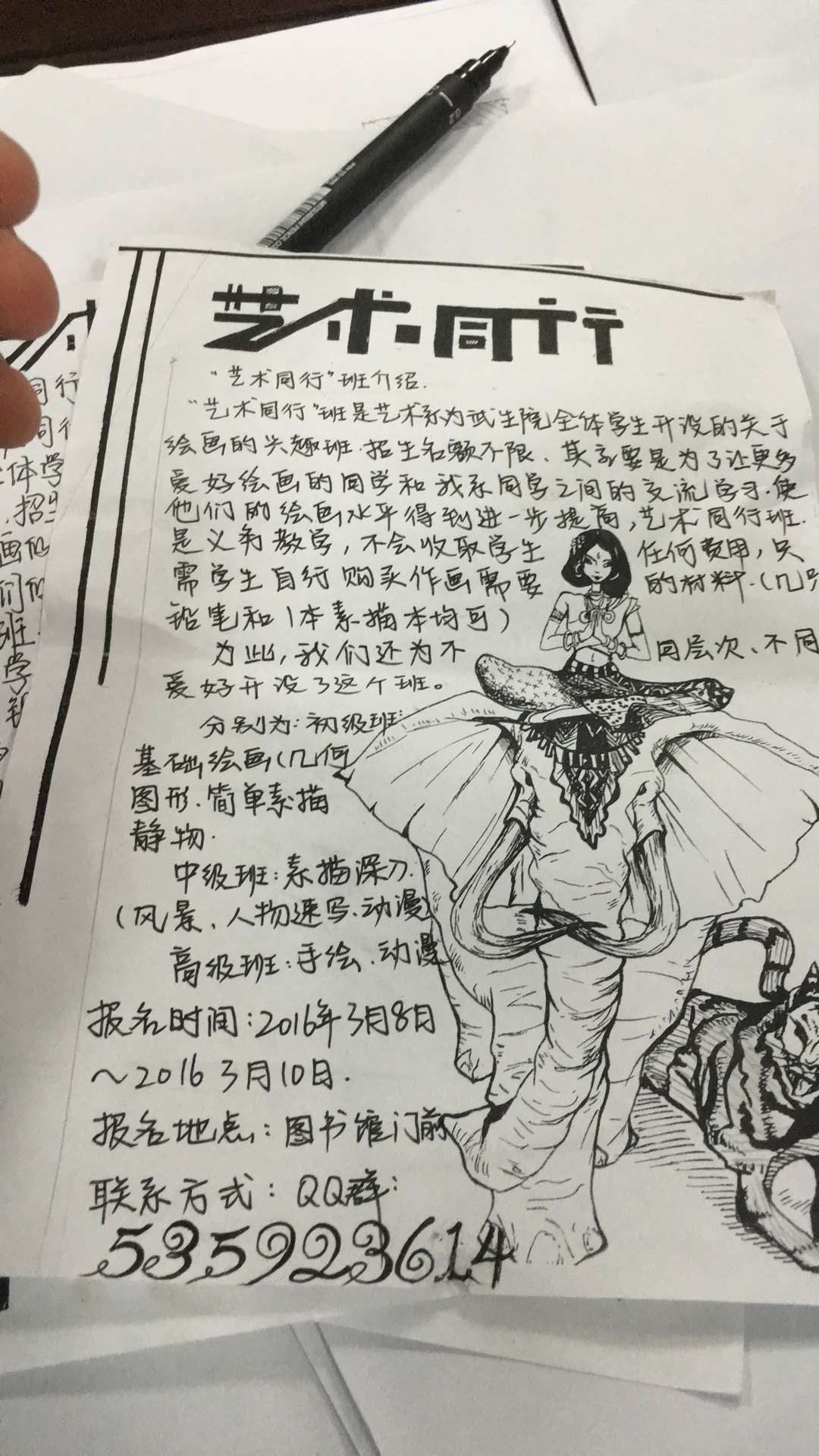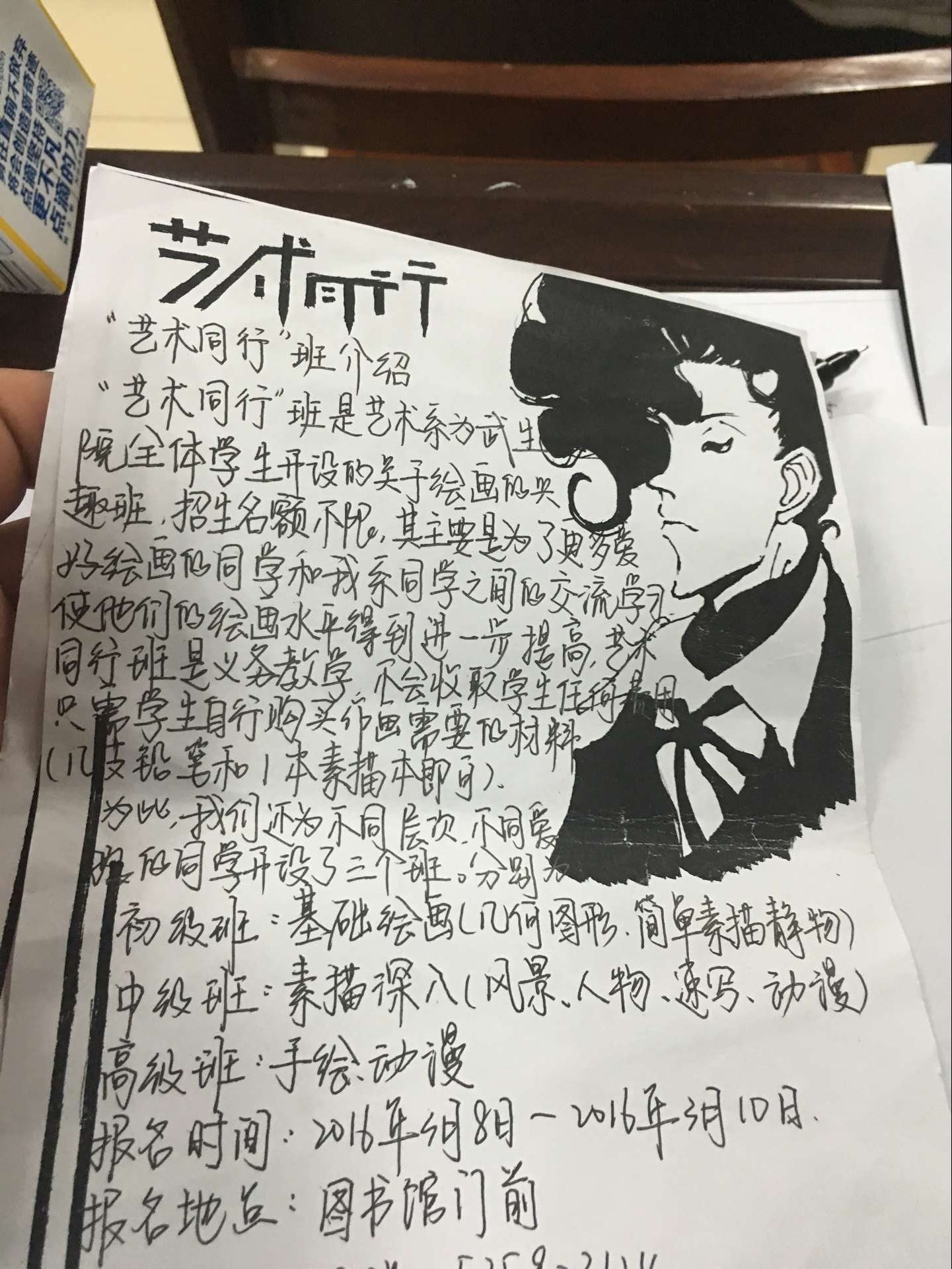 艺术同行活动,是武汉生物工程学院艺术系青协为全体同学开设的绘画兴趣班,招生人数不限,主要的目的是为了更好的让全校同学更好的交流学习,让绘画水平有所提升,并且不向学生收取任何费用,自备工具即可。