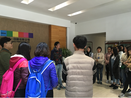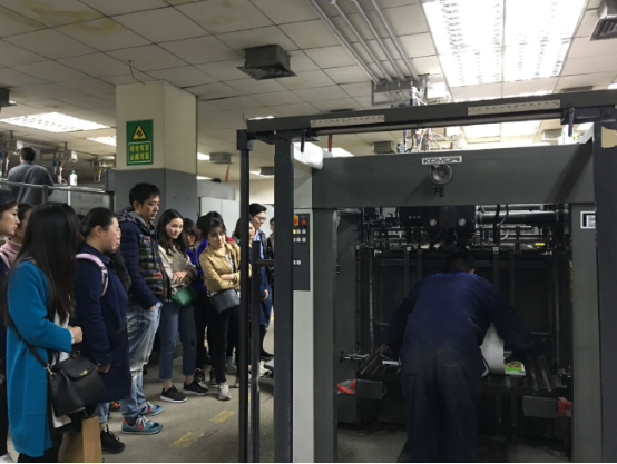 在参观了印前的设计、排版环节后,同学们紧接着来到了公司的三楼,在这里金老师介绍了书籍排版后进入印刷的流程,并请工人展示了机器印刷着色的高超效率,让同学们大开眼界。