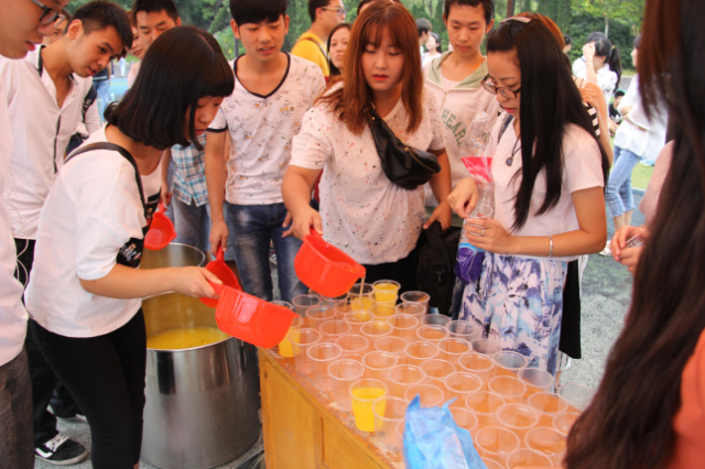 (支部成员为新生们分装橙汁)