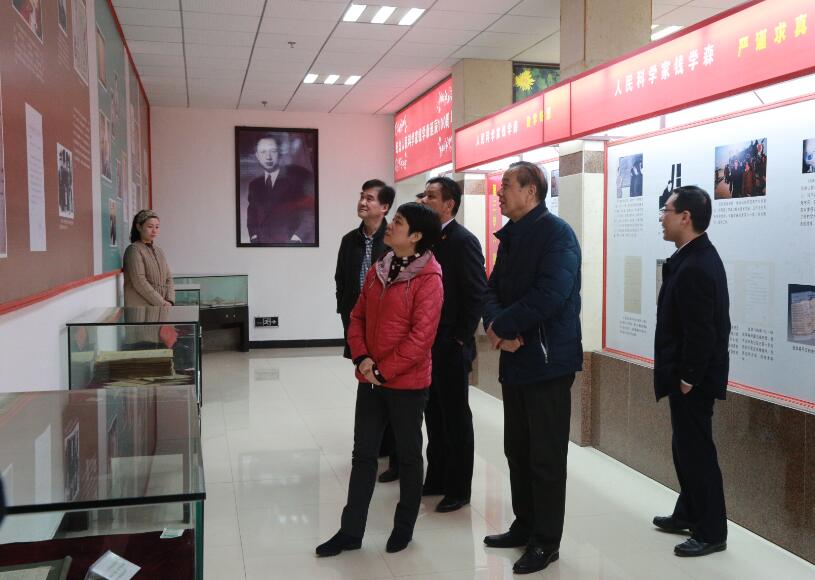 李翎副行长一行在李友清校长陪同下参观了校园。图为参观我校钱学森纪念馆。