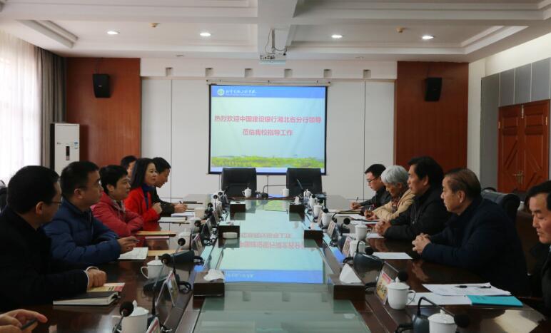 余毅代表学校对李翎一行的到来表示欢迎,对中国建设银行湖北省分行长期以来支持和帮助学校的建设发展表示感谢,并简要介绍了学校办学基本情况和十三五发展规划要点。