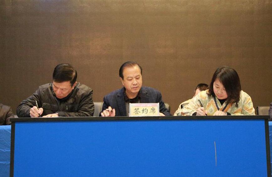 李友清校长(中)与各院(系)党政负责人签订2017年度目标责任管理任务书。