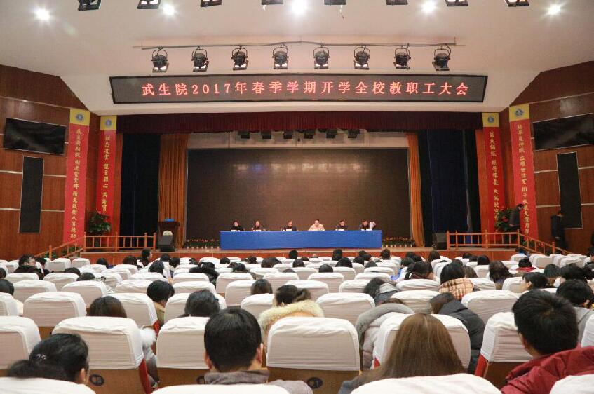 校长李友清教授作了题为《深化教学改革 打造特色品牌 进一步提升教学质量和办学水平》的工作报告。他指出,2016年是武生院深化教育教学改革、深度转型发展的一年,是实现“十三五”教育事业发展规划的开门红之年,是全校师生团结拼搏,攻坚克难,稳中求进、稳中提质、稳中增效,创造一个又一个辉煌业绩的一年。学校先后获批首批“全国深化创新创业教育改革示范高校”、首批“全国民办高校创新创业教育示范学校”,“湖北省众创空间”、湖北省优秀大学生创新创业俱乐部、武汉市大学生创业基地,再次被认定为“湖北省大学生创业示范基地”、“湖北省大学生创业孵化示范基地”,获评湖北省首批“生态园林式学校”、“湖北省平安校园”等多项荣誉称号。李友清强调,2017年学校教育教学改革要以立德树人为根本任务,以特色发展、提高人才培养质量为核心,以转型发展为主线、服务社会为宗旨,以打造“双创”教育品牌为突破口、凸显个性化教育,以乐教乐学和应用型人才能力培养为前提,深化“双百工程”,在校企合作、产教融合,创新人才培养模式和协同育人机制上下苦功。要进一步深化人事分配制度与教师评价制度改革,加大引进与培训力度,狠抓“双师双能型”教师队伍建设;进一步深化目标责任管理体制改革,狠抓应用科研、发明专利等,努力提升服务地方创新驱动发展能力。具体来说,一是要推进“双创”教育与专业教育的深度融合,打造“双创”教育品牌。二是要凸显个性化教育,深化教学内容、方法、手段改革。三是要抢抓申硕机遇,建好特色(重点)专业。四是要进一步推进校企合作、产教融合,深化转型发展。五是要强化目标责任制管理,努力提高教学质量与管理水平。六是要进一步做好教师培训工作,加大督导工作力度。七是要以迎接审核评估为契机,做到“一评三促”。八是要转变作风,提高素质,狠抓落实。