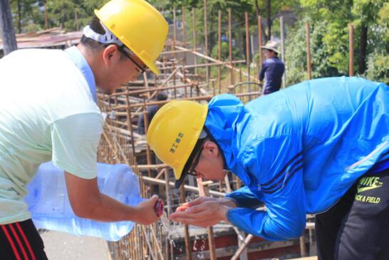 在校内建筑工程实践基地,建筑工程学院2014级教改实验班的同学们正在新广厦建筑公司技术人员的指导下,扎钢筋、搭楼板、做基桩……万梦吉同学擦着汗说:“在这里,我们头顶烈日,脚踩钢筋混凝土,深深地体会到了生活的艰辛,这将是我今后人生中的一笔宝贵财富。同时,建筑工程课本上学到的知识,都在这里一一得到了验证。”图为高温炎热的工地上,同学们用凉水洗把脸后,继续工作。