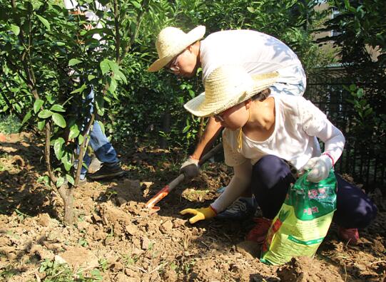在长河港湾橘园实践基地,园林系首届园林-园艺工匠型人才培养教改实验班的同学们正头戴草帽,手拿铁锹,背扛喷壶,在橘园穿梭忙碌着,额头上黄豆般的汗珠流个不停。人群中,一名晒得黝黑的女生格外显眼。她叫汪琴,园林系13级园林专业学生。“别看我个头小,我可是班上的‘女汉子’。”汪琴告诉记者,“我是武汉本地人,独生女,这段时间,蚊虫、灰尘、汗水与我作伴,终于体会到父母工作养家是那么不容易,我一定不会放弃的。”图为汪琴同学(右)正在给橘树施有机肥料。