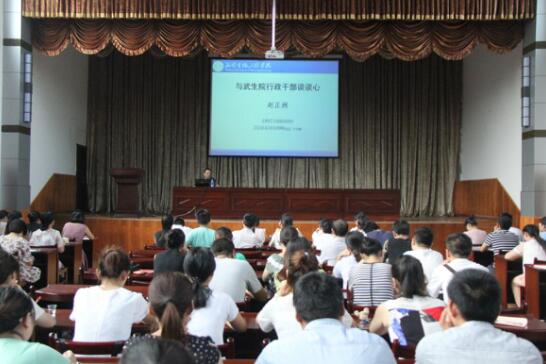 赵正洲以《与武生院行政干部谈谈心》为题,重点阐述了大学行政管理人员的角色定位、基本素养、基本素质和成长路径。他认为,大学行政管理人员是大学事业的创造者、大学决定的贯彻者、大学决策的参谋者、大学合力的协调者、大学团队的领导者和大学形象的展示者。大学教职员工的职业劳动具有特殊性,是以知识为中介的人际关系活动过程,对自身综合素质要求较高。赵正洲指出,作为大学行政管理人员必须具备机遇意识、科学思维、履职能力、交往能力等基本素质,还要坚持“抬头看路”,熟知国家高等教育的方针和政策,掌握高等教育和大学管理的基本知识,践行“两学一做”、“三严三实”,不断提升个人自身修养。他表示,学校将为行政管理人员的成长搭建事业平台、畅通发展通道、打造公平环境、营造良好氛围,不断提升教职工幸福指数。