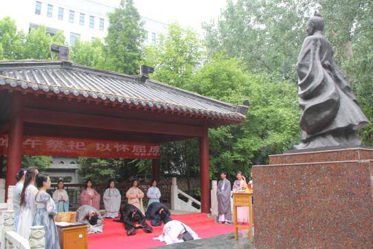 本网讯(记者 任丽琼 摄影 肖亚慧)盥手、拭净、迎神、初献、亚献、终献、饮福受胙、送神、分胙、洒扫礼成……6月7日中午,我校学子身着汉服,相聚楚风园求索书院屈原铜像前,按照传统礼仪祭祀屈原。